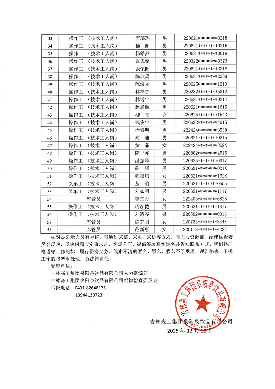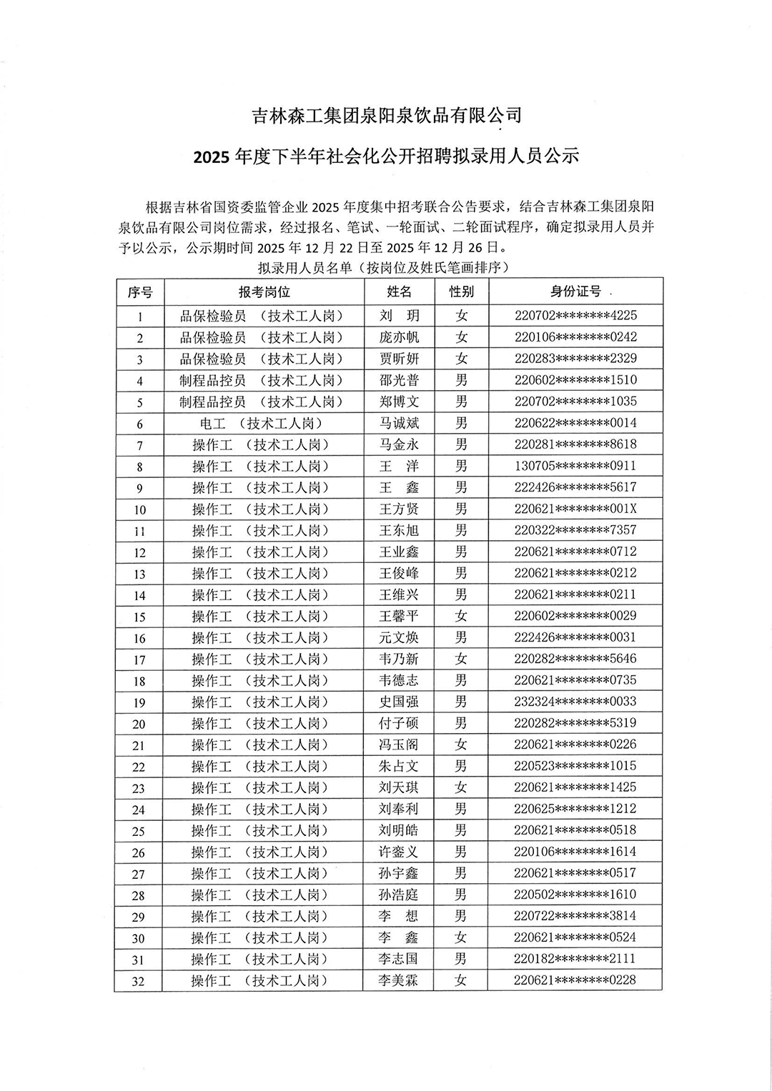 吉林森工集團(tuán)泉陽泉飲品有限公司2025年度下半年社會化公開招聘擬錄用人員公示